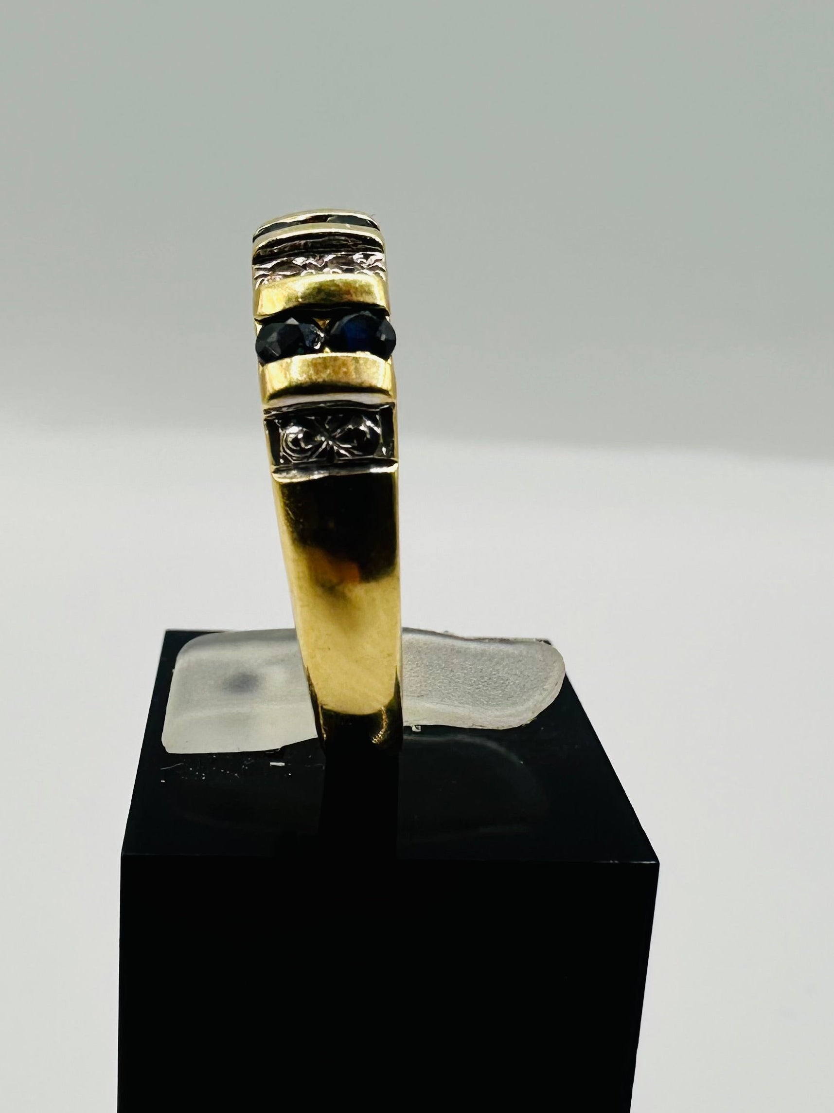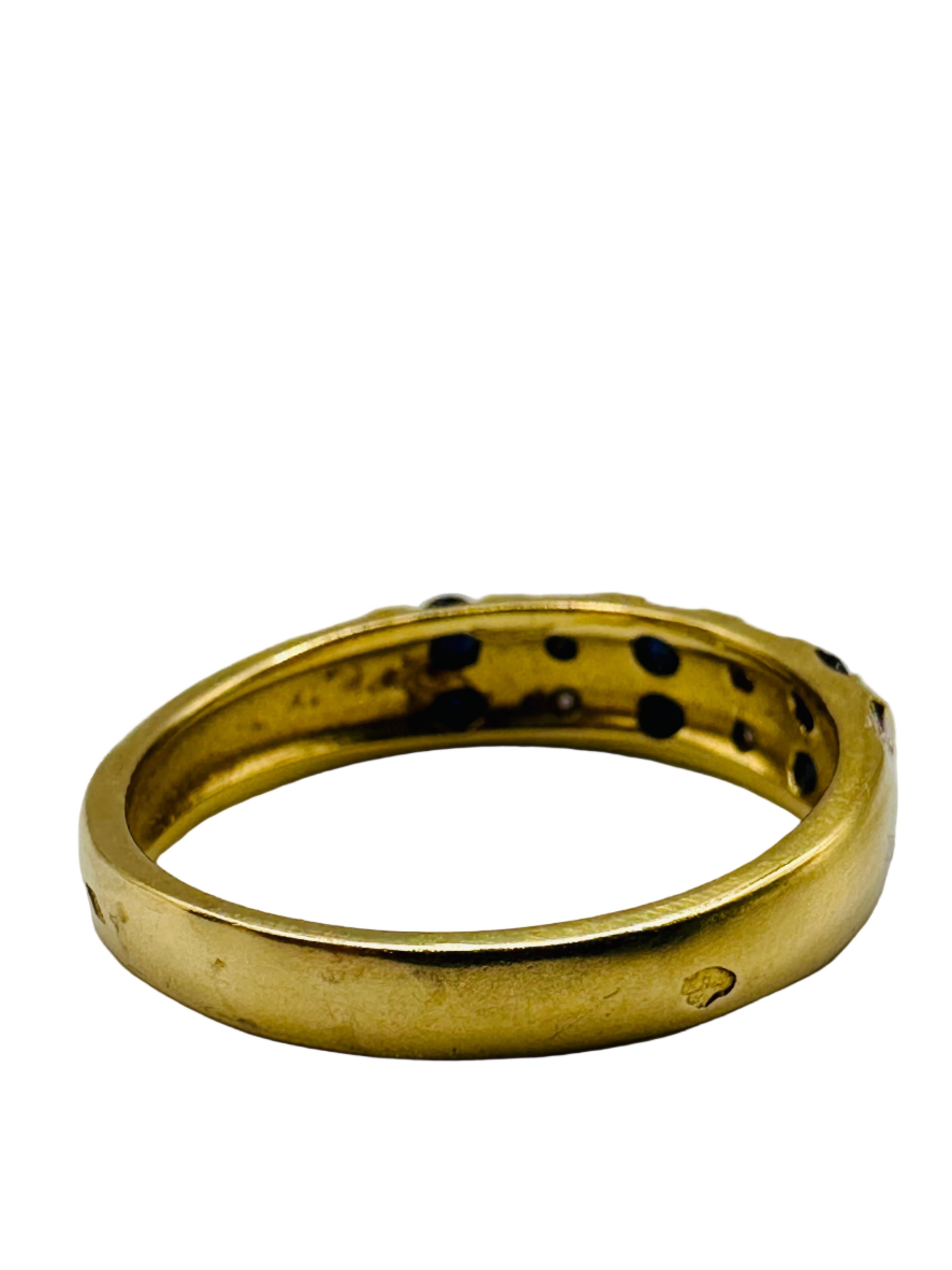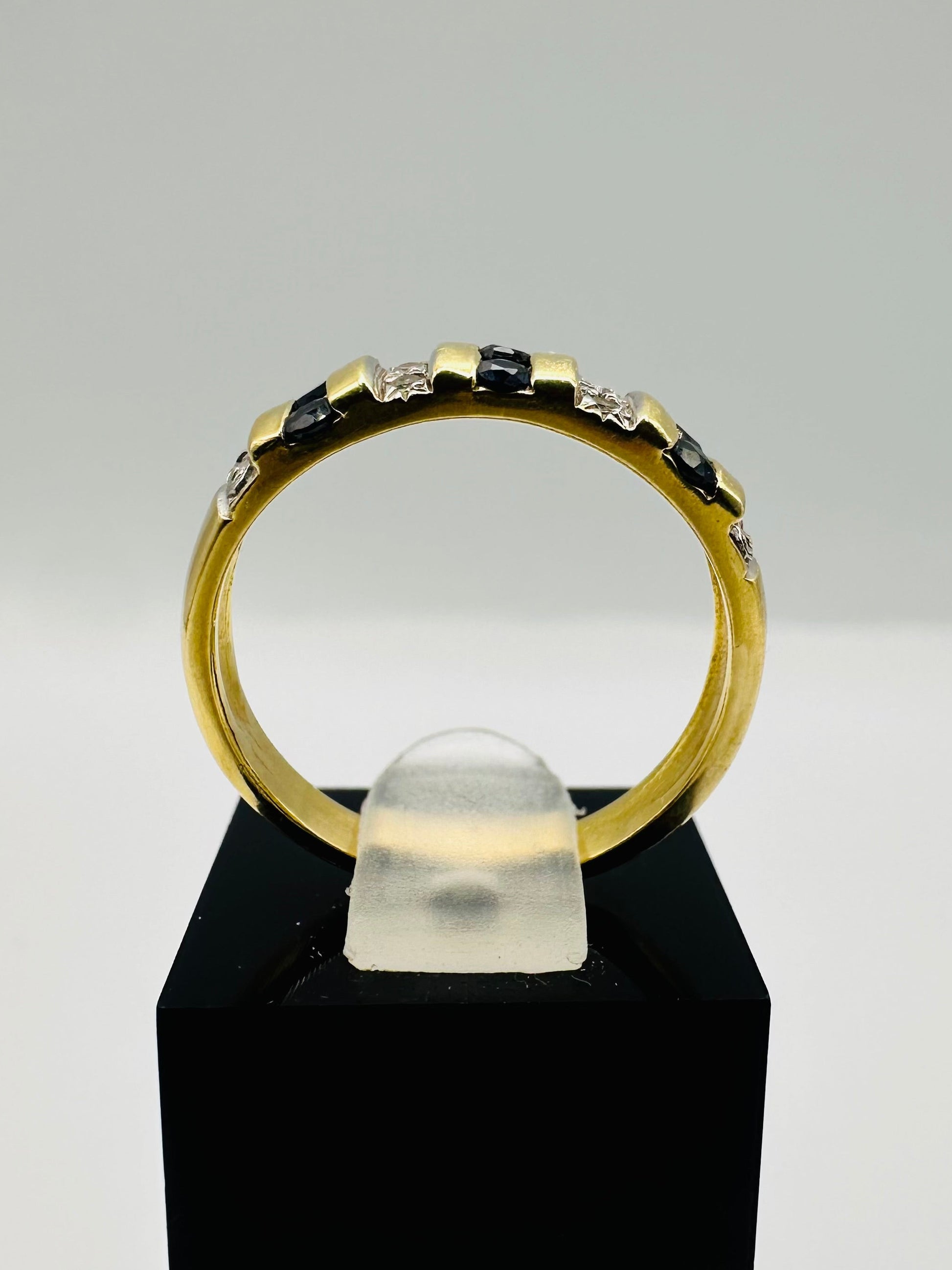 Demi-alliance en or jaune 18 carats, élégamment sertie de six petits saphirs et quatre éclats de diamants. Taille 56, poids 3,94 g. Un bijou raffiné qui allie couleur et éclat pour sublimer votre doigt avec subtilité.