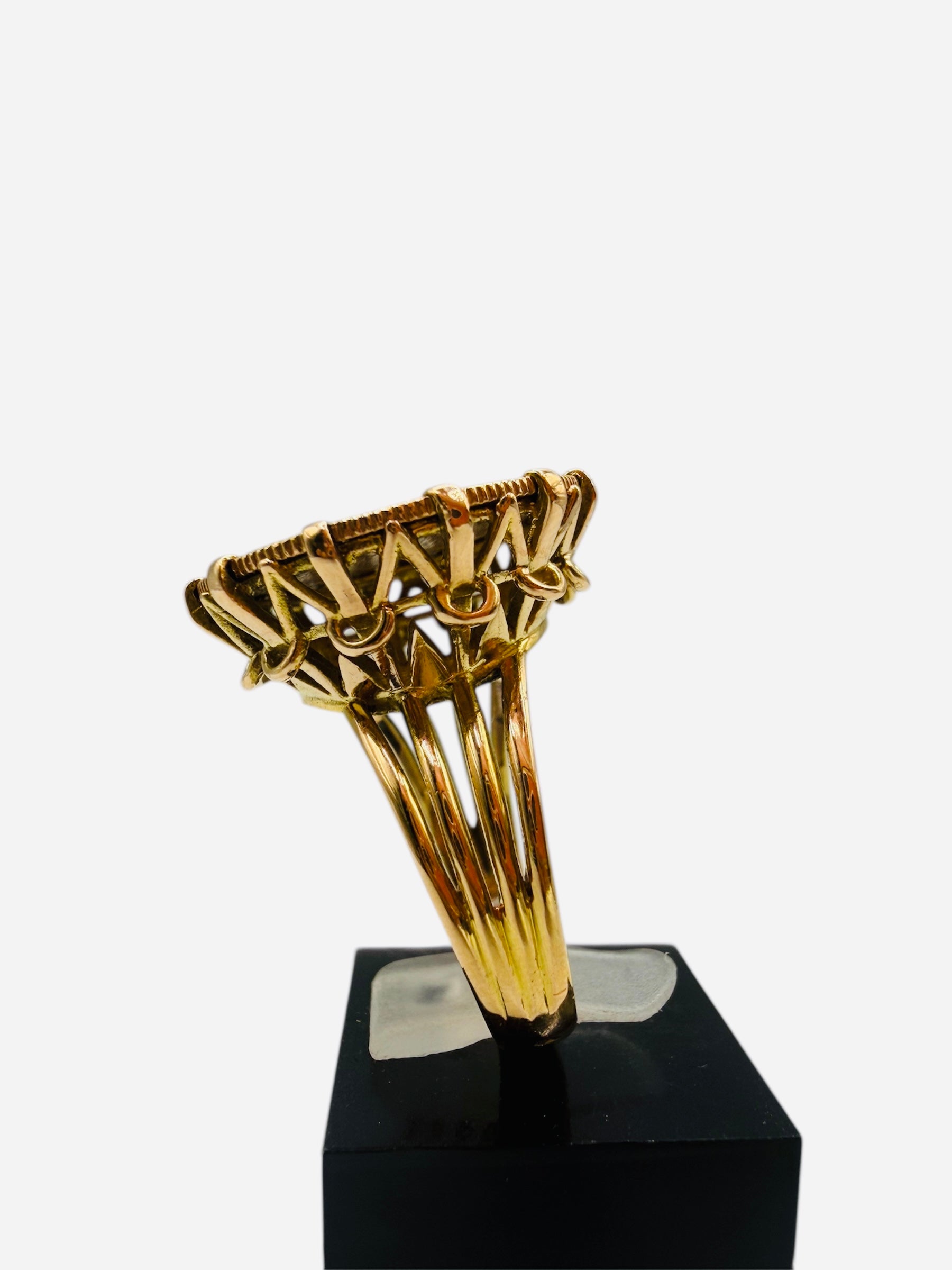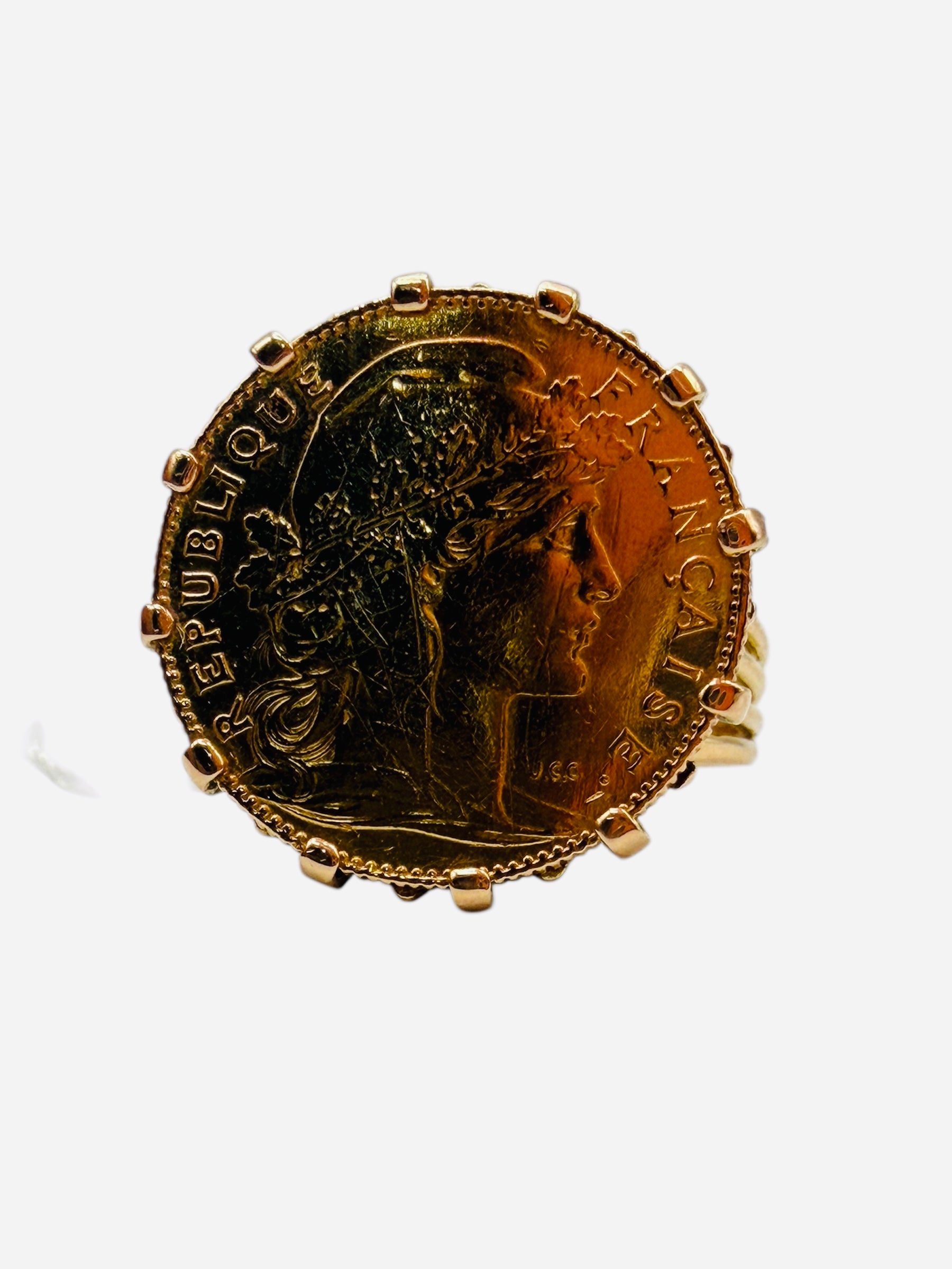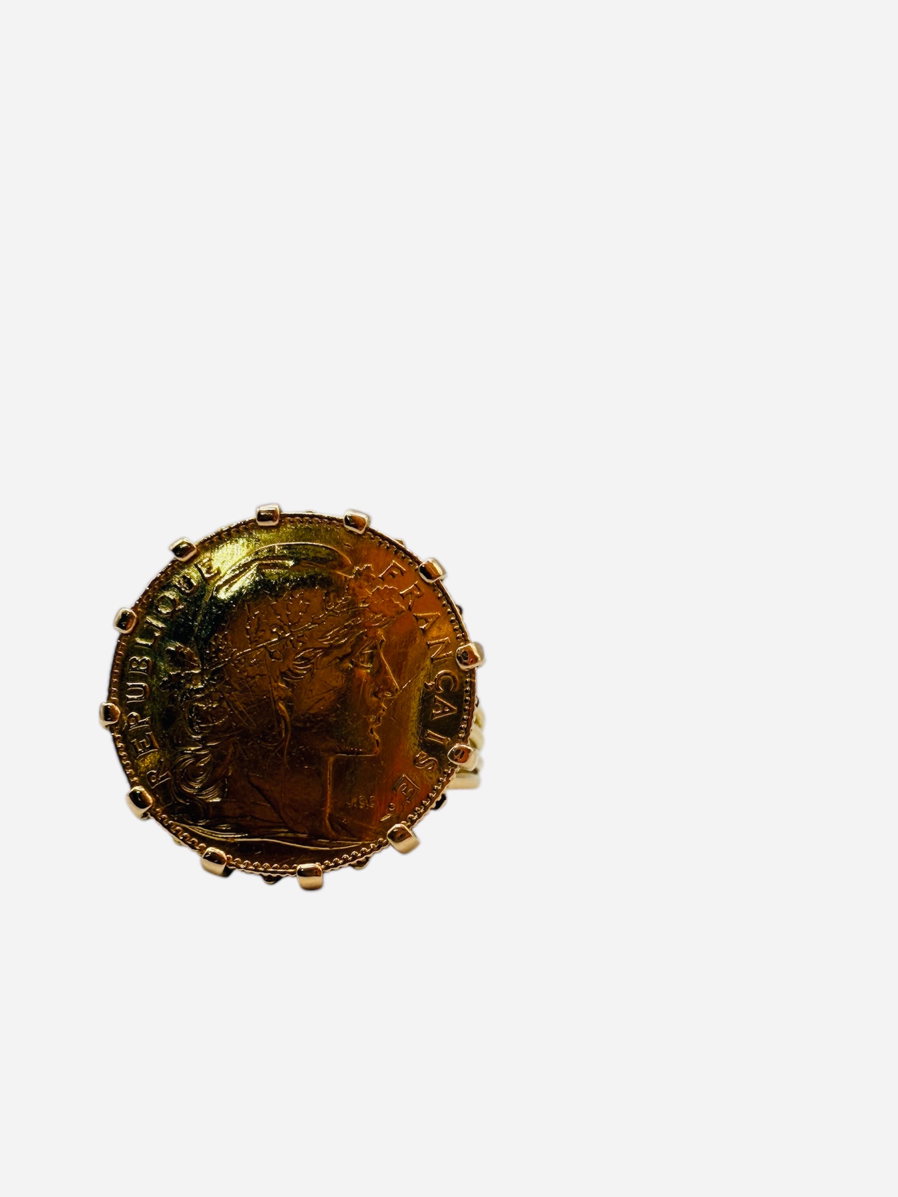 La bague porte pièce Marianne de 10 francs, pesant 8,87 g et de taille 57,5, combine l'élégance à une valeur historique. Fabriquée en or 21,6 et 18 carats, elle offre une durabilité accrue tout en étant un bijou raffiné, idéal pour les amateurs de pièces de collection et d'artisanat de luxe.