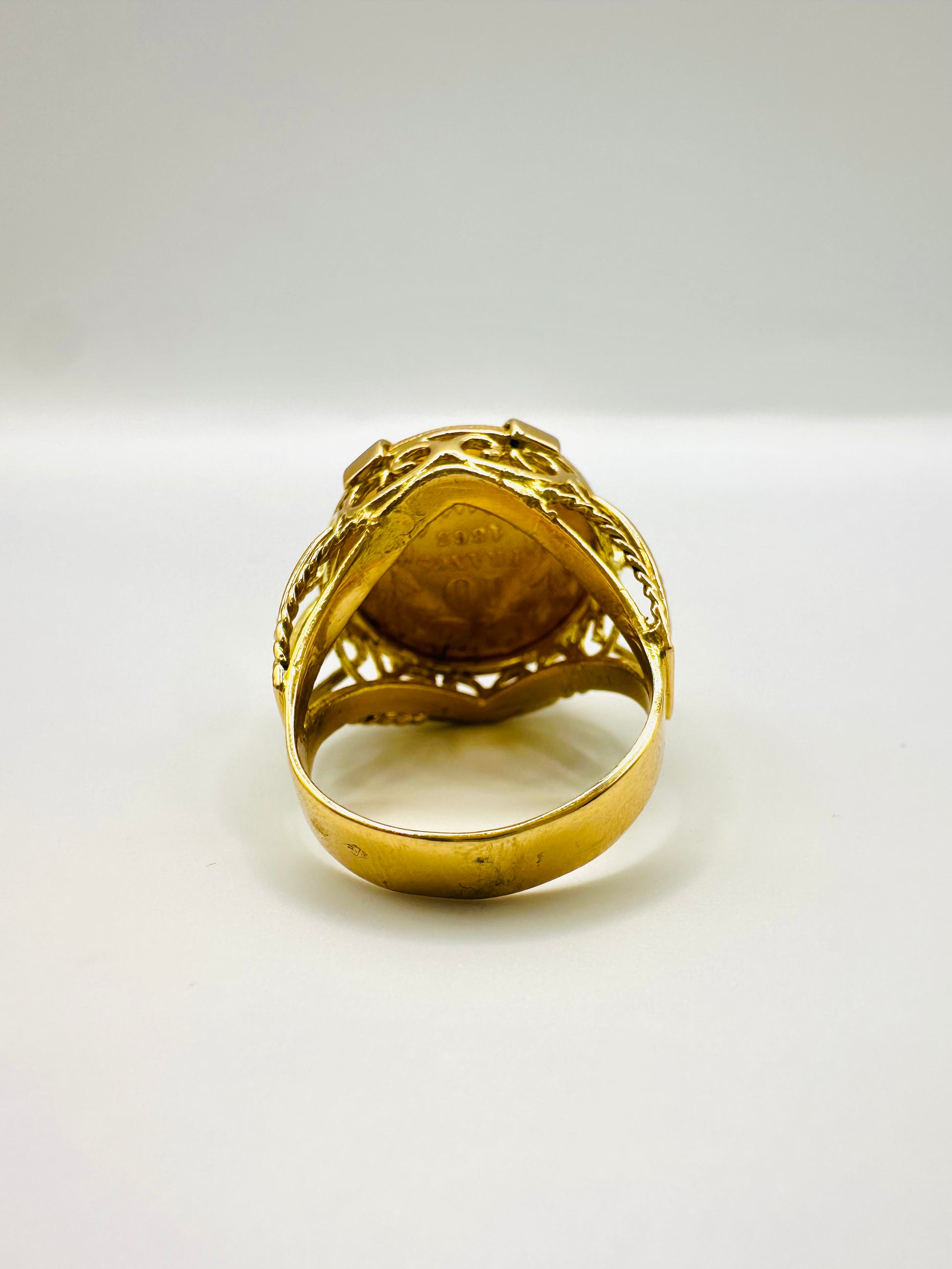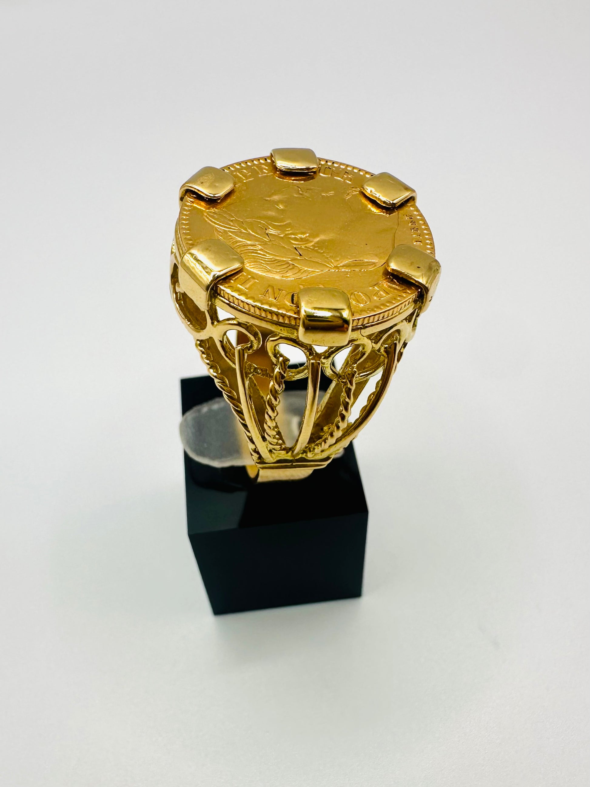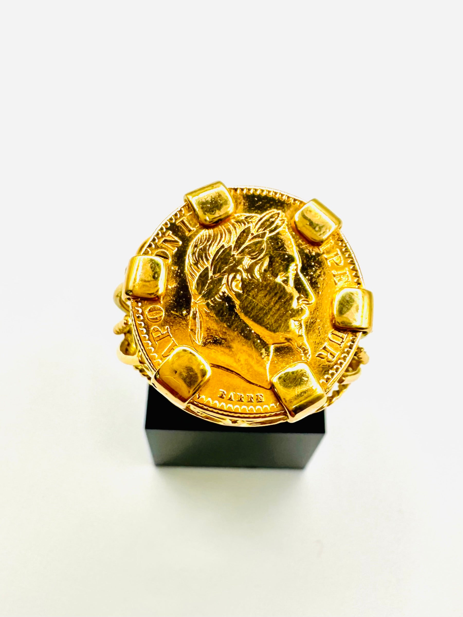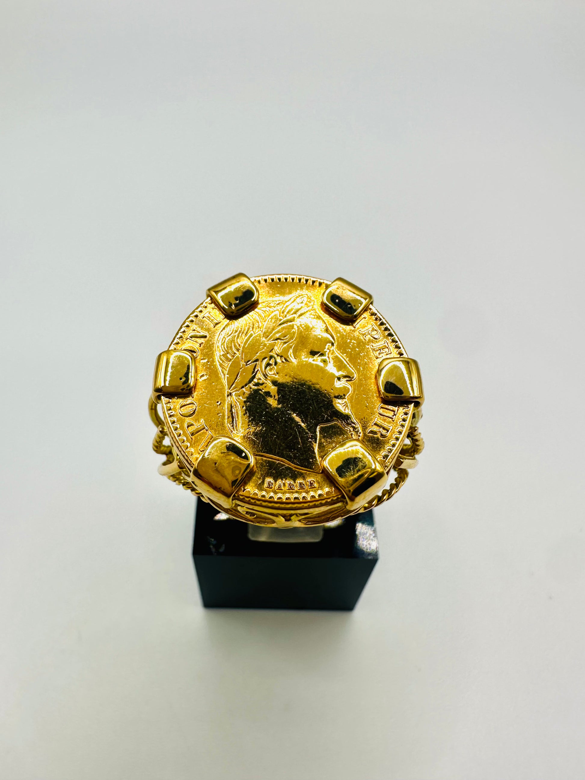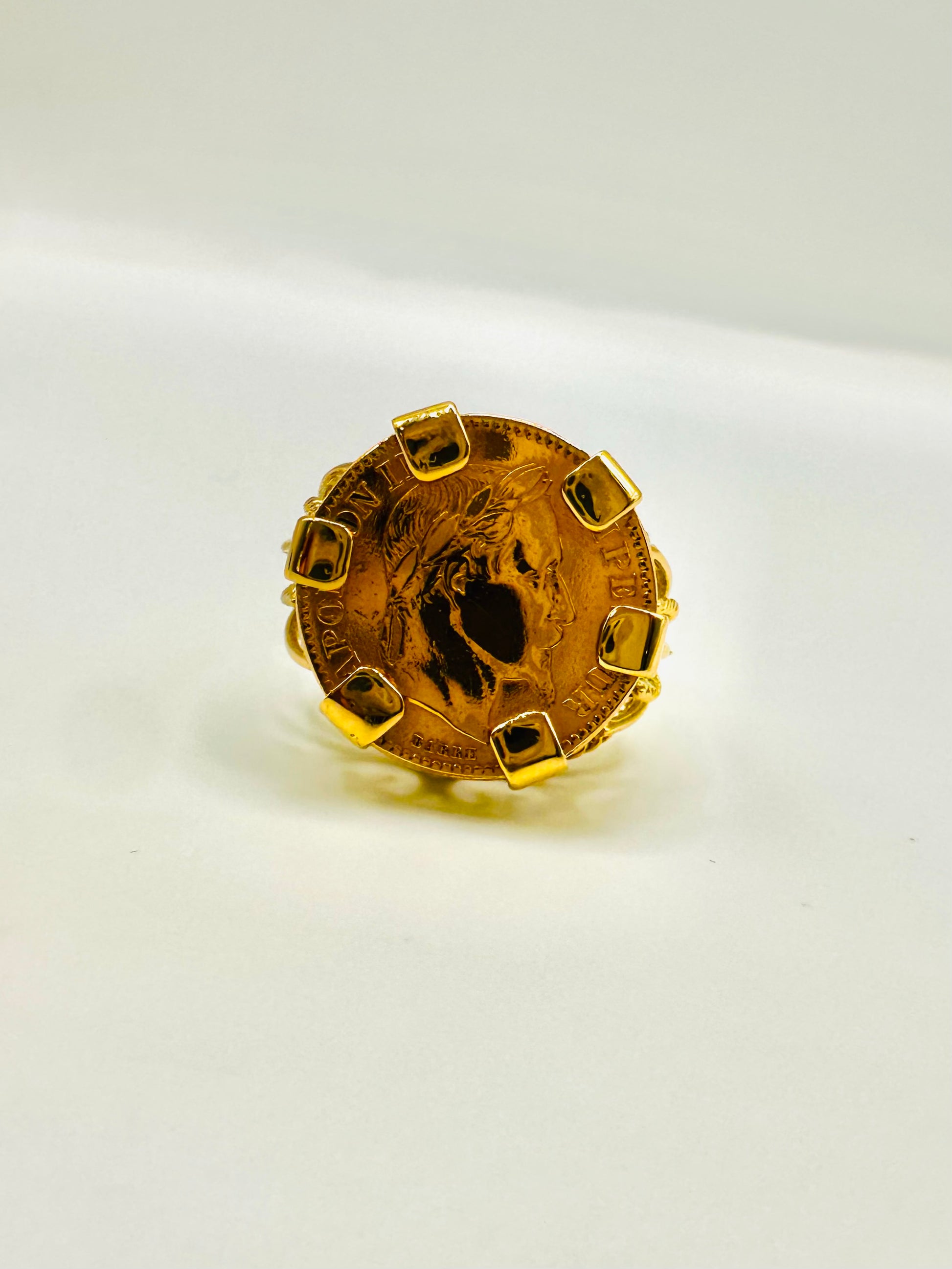 Alliant prestige et finesse, cette bague porte-pièce met en valeur une authentique pièce de 10 francs Napoléon en or 21 carats (900‰), minutieusement enchâssée dans une monture artisanale.