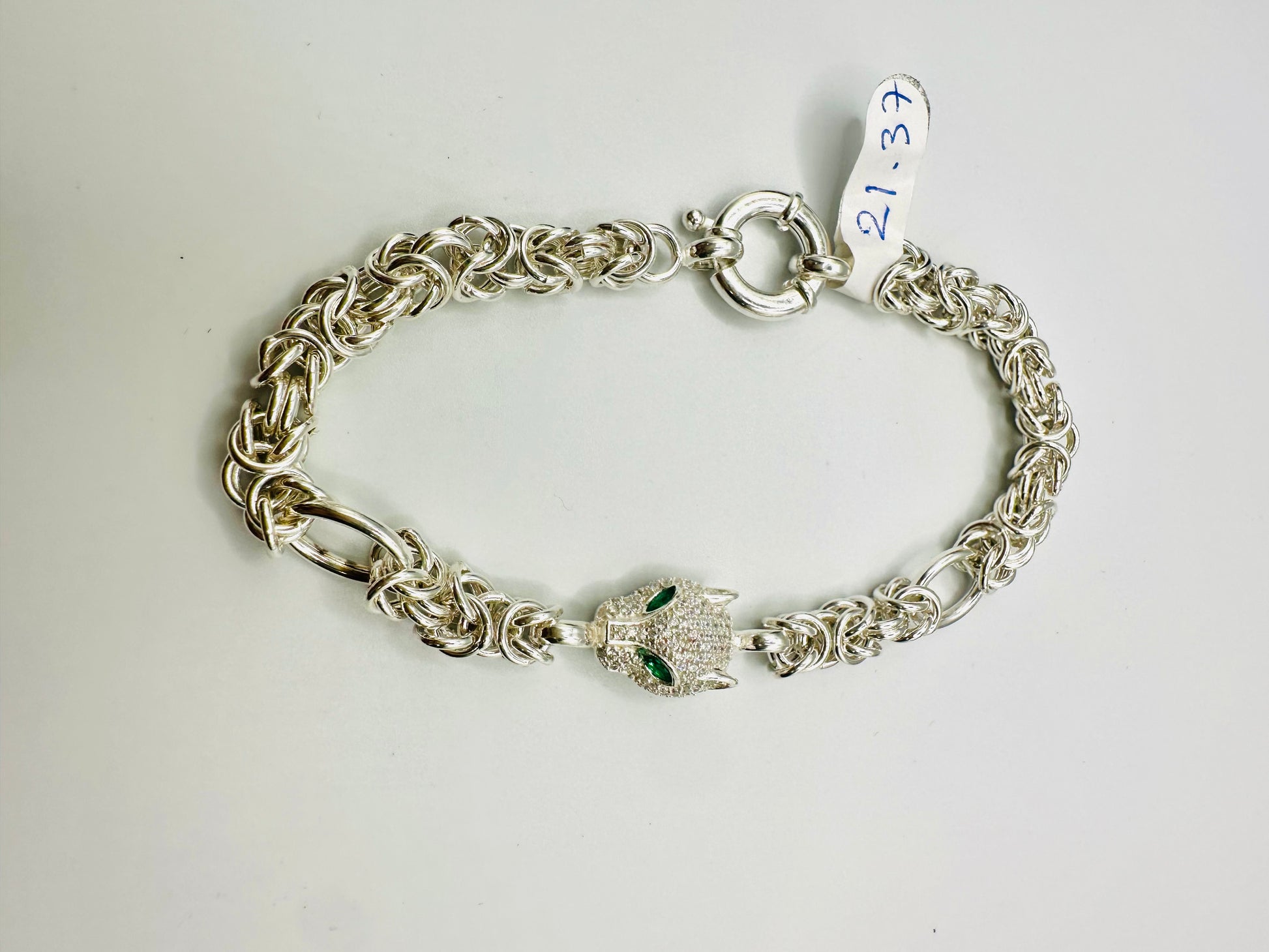 Puissance, prestige et caractère se retrouvent dans ce bracelet gourmette au design audacieux, orné d’une tête de léopard perlée, symbole de force et de noblesse. Son regard perçant, accentué par des yeux verts intenses, attire instantanément l’attention.
