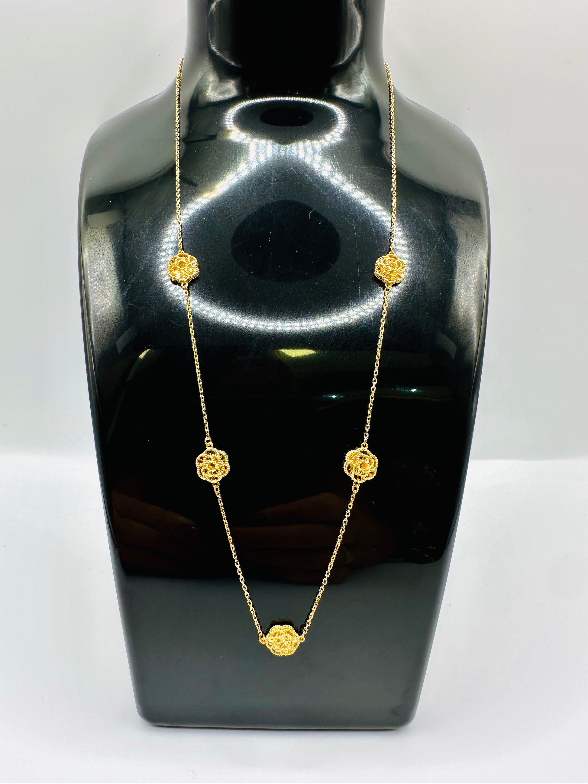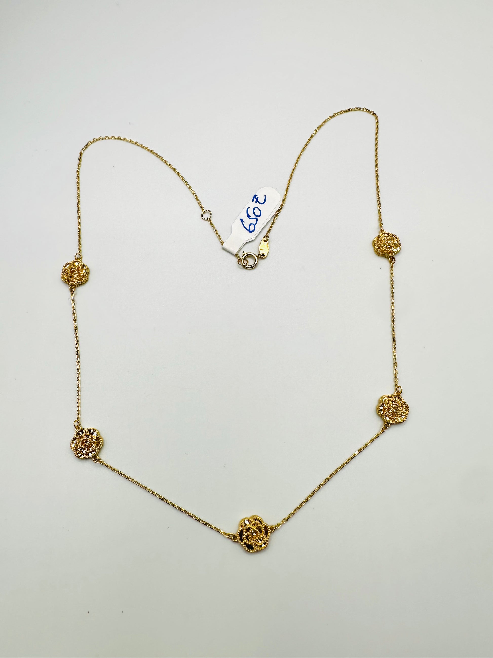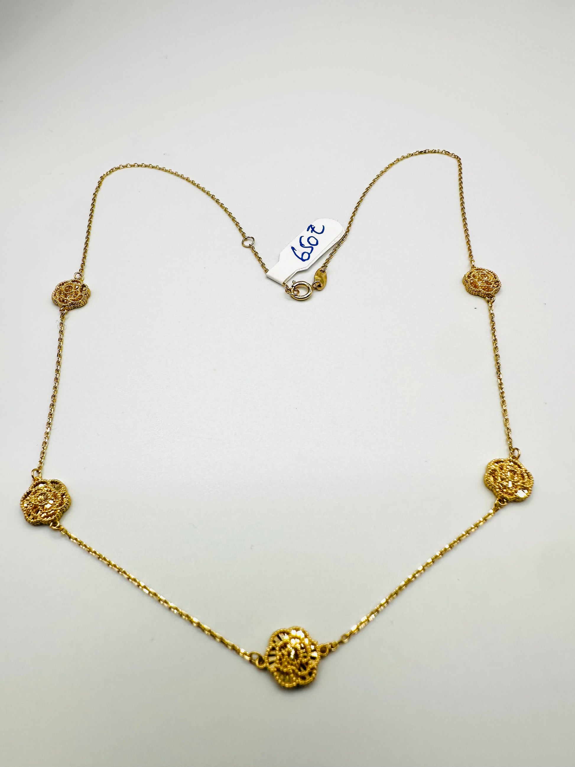 Un collier raffiné composé de plusieurs petites fleurs finement travaillées, symbole de féminité et de légèreté. Sa délicatesse en fait un bijou élégant à porter au quotidien ou lors d’occasions spéciales.