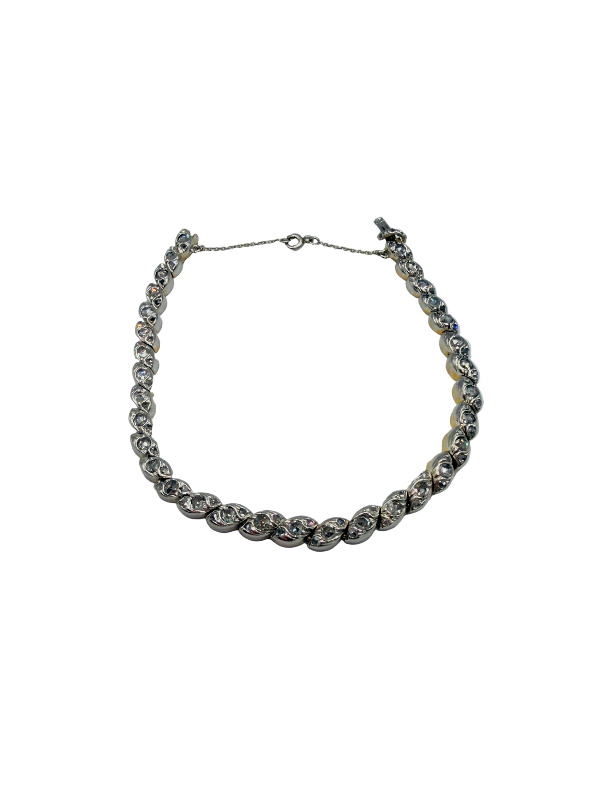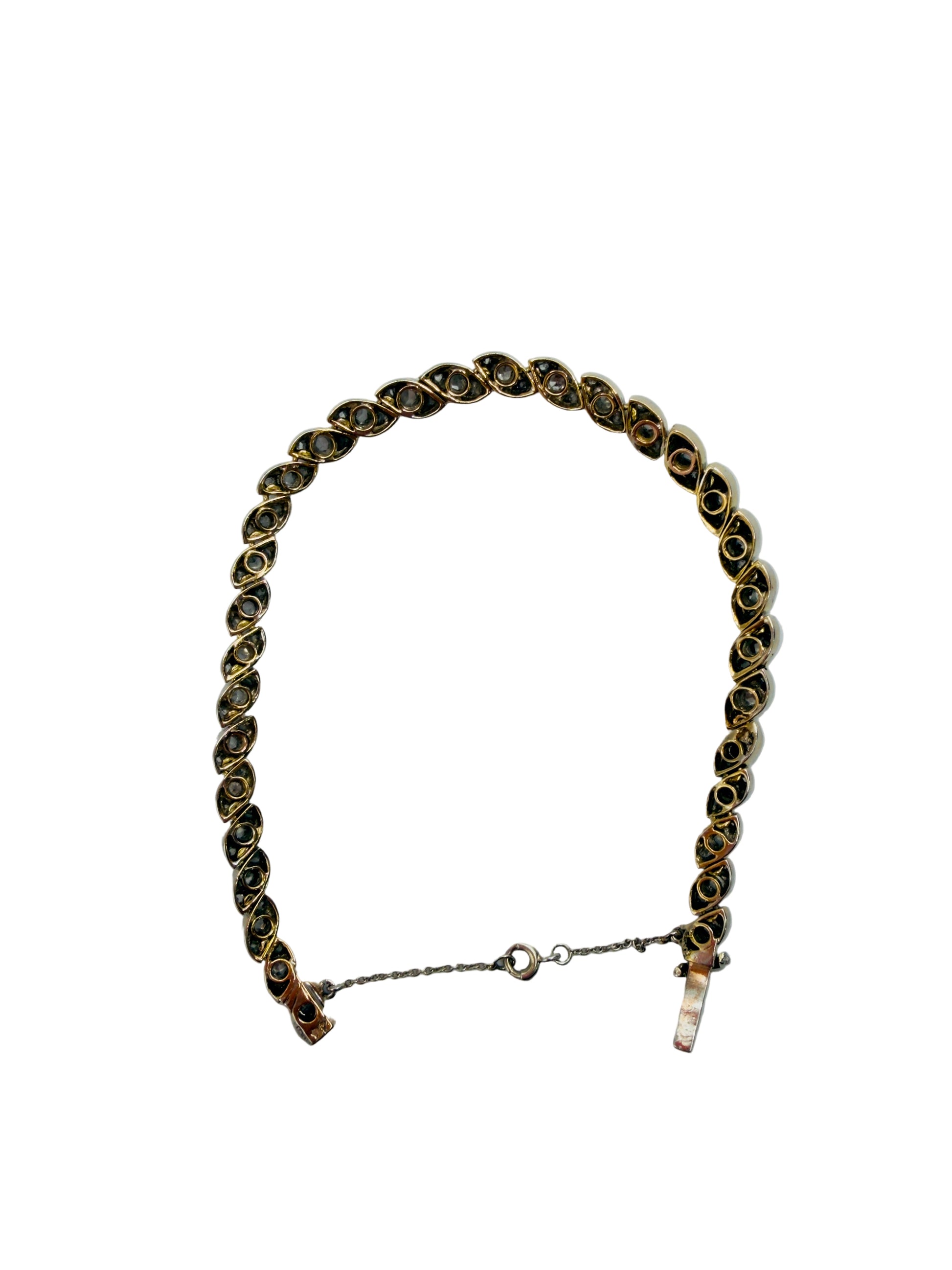 Ce bracelet fin en or blanc et jaune est un bijou très ancien avec 32 maillons contenant chacun un grand diamant en forme de fleur et deux petits diamants aux extrémités, pour un total de 32 grands diamants et 64 petits diamants. Le bracelet pèse 13,51g et mesure 17cm, offrant une élégance et un éclat intemporels.