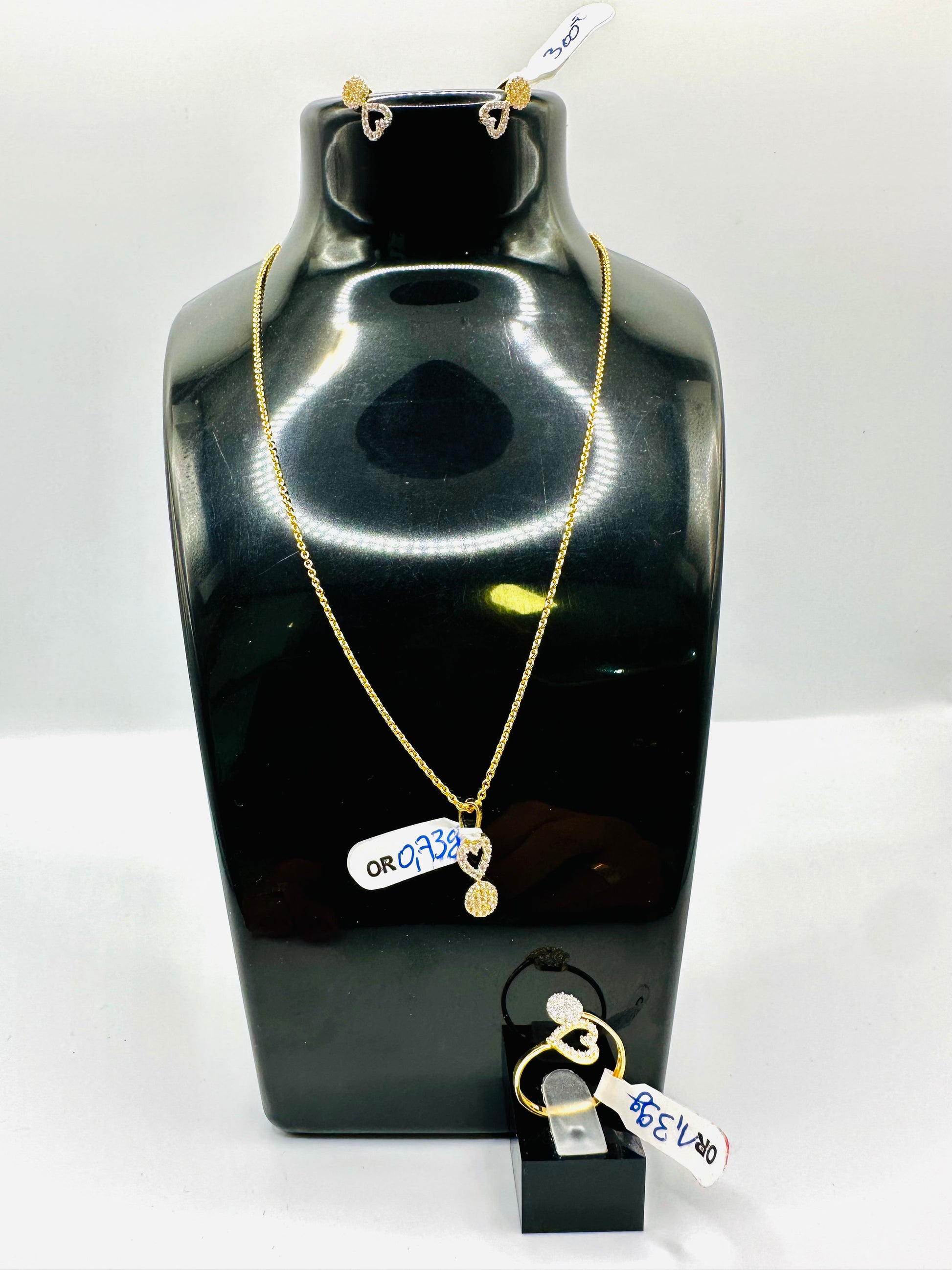 • Composants : Chaîne et pendentif cœur, boucles d’oreilles assorties et une bague délicate